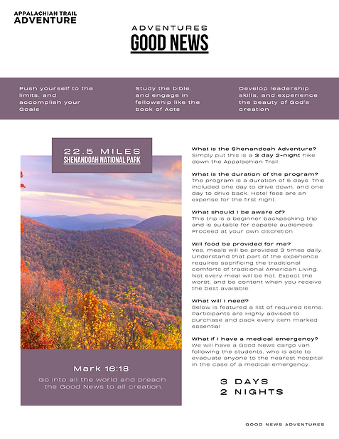 This adventure is a "book of acts" journey down a 22.5 mile portion of the Appalachian Trail, in Shenandoah National Park. This 5 day journey is led by a Pastor with a heart for community and evangelism. Along the route, our teams of Trail Blazers, participate in hands-on acts of service, daily prayer, evangelistic opportunities, a our bible study curriculum.